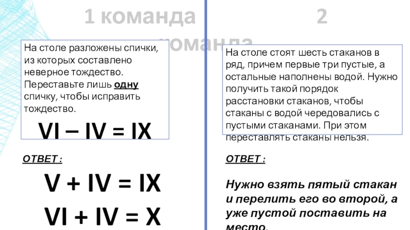 На столе стоят шесть стаканов в ряд, причем первые три пустые, а остальные наполнены водой. Нужно получить такой порядок расстановки стаканов, чтобы стаканы с водой чередовались с пустыми стаканами. При этом переставлять стаканы нельзя.
