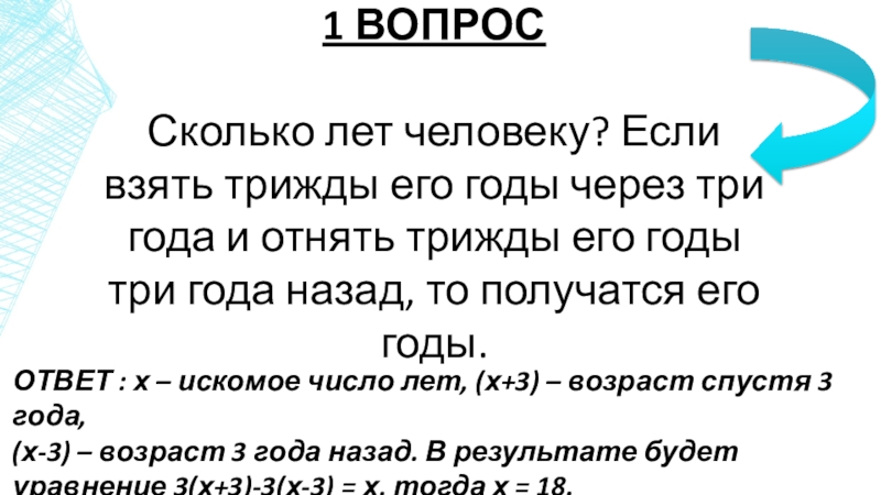 ОТВЕТ : х – искомое число лет, (х+3) – возраст спустя 3 года,
