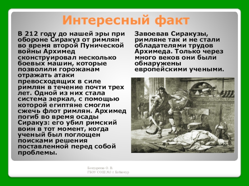 Завоевав Сиракузы, римляне так и не стали обладателями трудов Архимеда. Только через много веков они были обнаружены европейскими учеными.