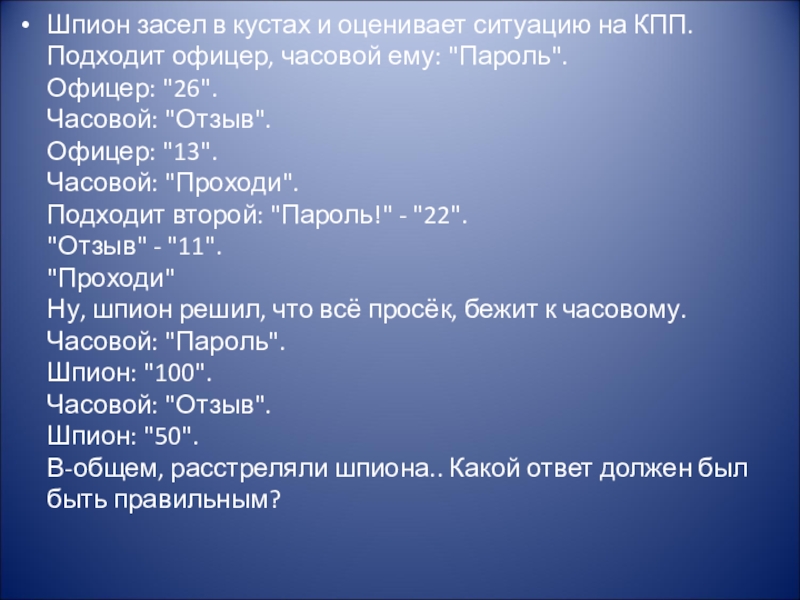 часовой ему: "Пароль".  Офицер: "26".  Часовой: "Отзыв".  Офицер: "13".  Часовой: "Проходи".  Подходит второй: "Пароль!" - "22".  "Отзыв" - "11".  "Проходи"  Ну, шпион решил, что всё просёк, бежит к часовому.  Часовой: "Пароль".  Шпион: "100".  Часовой: "Отзыв".  Шпион: "50".  В-общем, расстреляли шпиона.. Какой ответ должен был быть правильным?