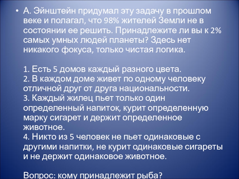 А. Эйнштейн придумал эту задачу в прошлом веке и полагал, что 98% жителей Земли не в состоянии