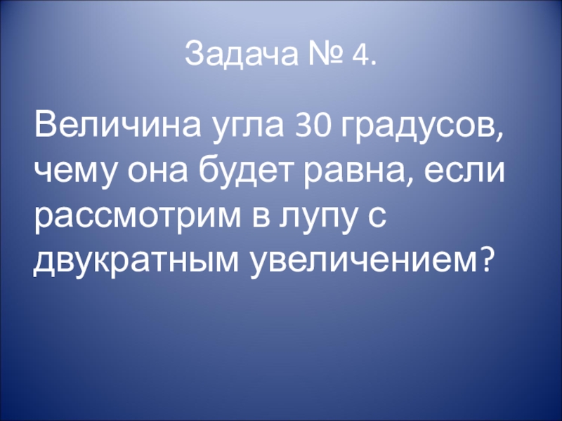 Задача № 4.Величина угла 30 градусов, чему она будет равна, если рассмотрим в лупу с двукратным увеличением?
