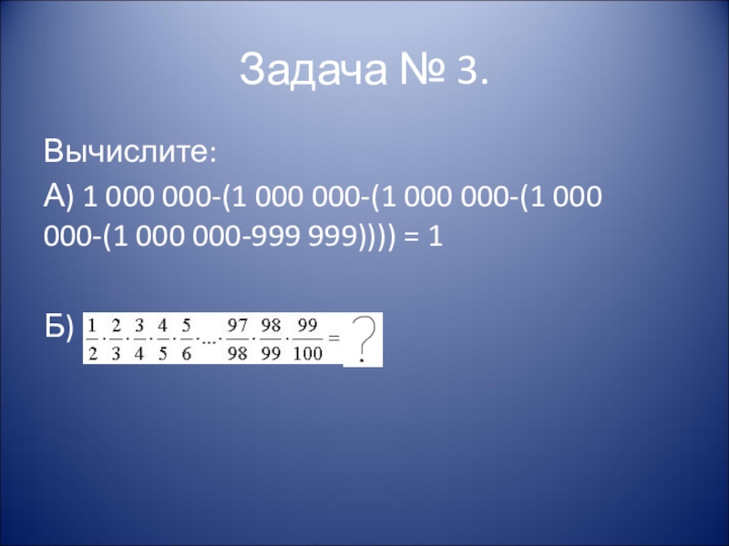 Задача № 3.Вычислите:А) 1 000 000-(1 000 000-(1 000 000-(1 000 000-(1 000 000-999 999)))) = 1Б)