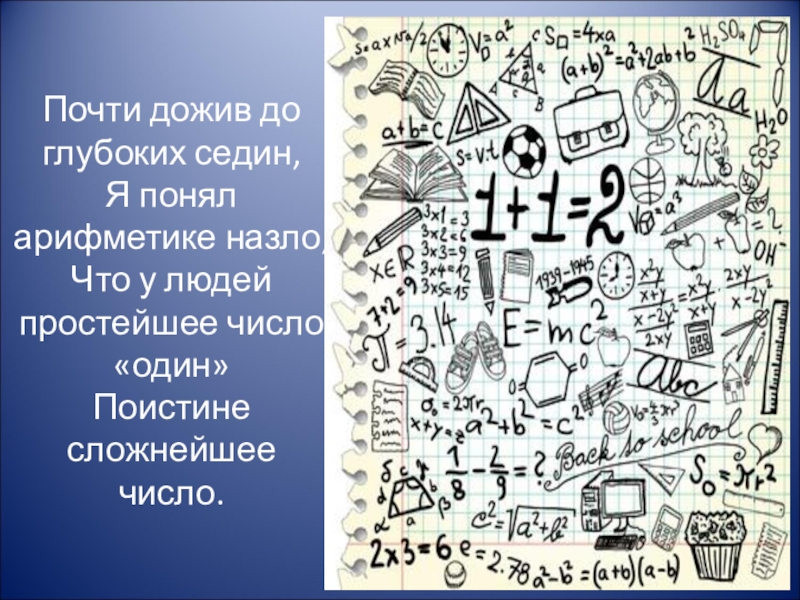 Слайд 5Почти дожив до глубоких седин,  Я понял арифметике назло,  Что у людей простейшее