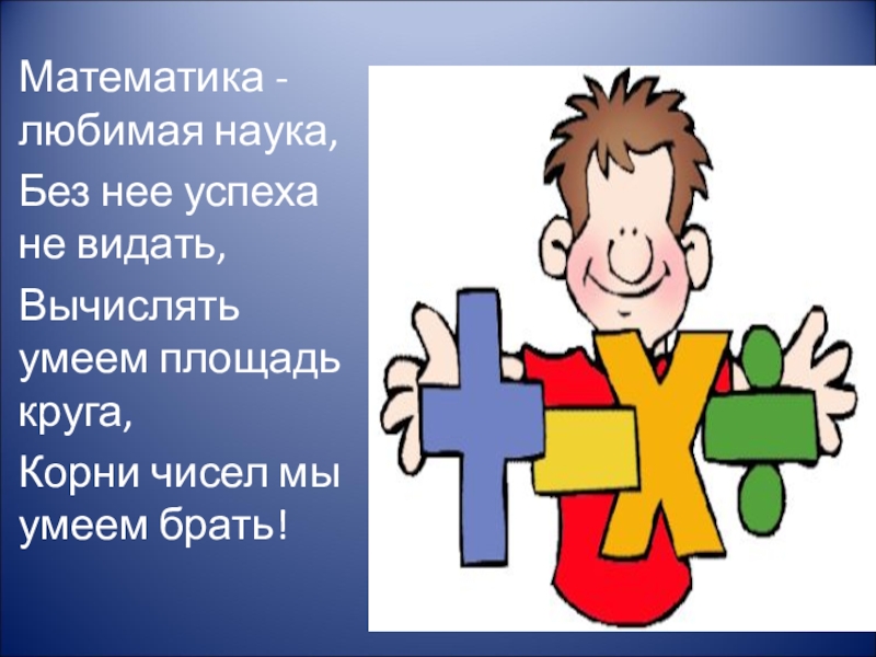 Математика - любимая наука,Без нее успеха не видать,Вычислять умеем площадь круга,Корни чисел мы умеем брать!
