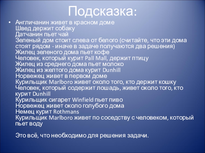 слева от белого (считайте, что эти дома стоят рядом - иначе в задаче получаются два решения) Жилец зеленого дома пьет кофе Человек, который курит Pall Mall, держит птицу Жилец из среднего дома пьет молоко Жилец из желтого дома курит Dunhill Норвежец живет в первом доме Курильщик Marlboro живет около того, кто держит кошку Человек, который содержит лошадь, живет около того, кто курит Dunhill Курильщик сигарет Winfield пьет пиво Норвежец живет около голубого дома Немец курит Rothmans Курильщик Marlboro живет по соседству с человеком, который пьет воду Это всё, что необходимо для решения задачи.
