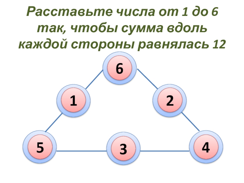 Слайд 20Расставьте числа от 1 до 6 так, чтобы сумма вдоль каждой