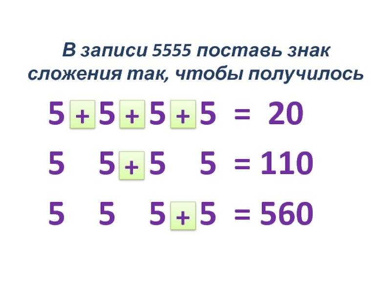 Слайд 15В записи 5555 поставь знак сложения так, чтобы получилось
