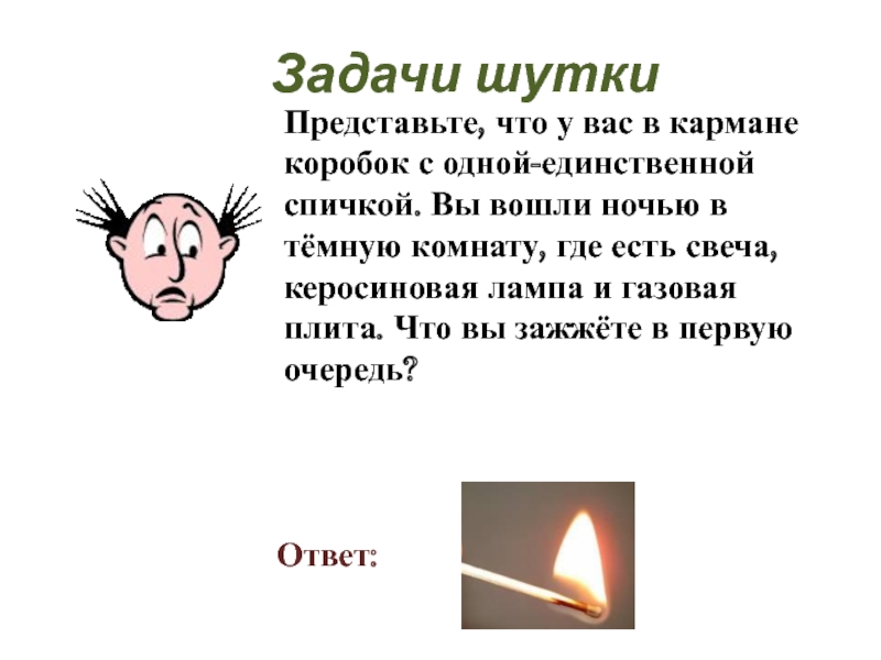 Вы вошли ночью в тёмную комнату, где есть свеча, керосиновая лампа и газовая плита. Что вы зажжёте в первую очередь?