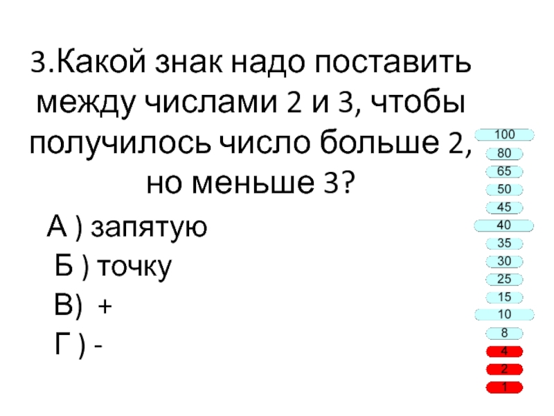 Слайд 243.Какой знак надо поставить между числами 2 и 3, чтобы получилось