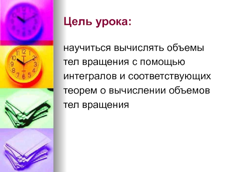 Цель урока:  научиться вычислять объемытел вращения с помощьюинтегралов и соответствующихтеорем о вычислении объемовтел вращения