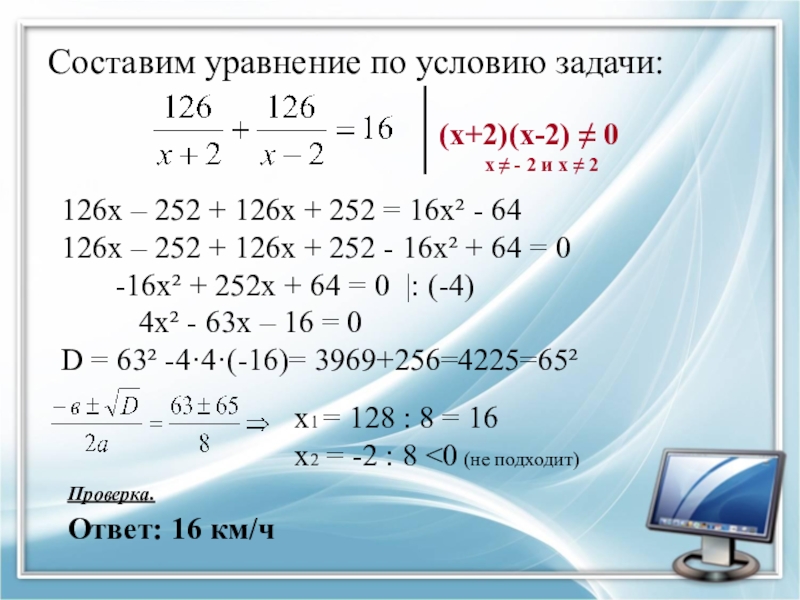 126х – 252 + 126х + 252 - 16х² + 64 = 0