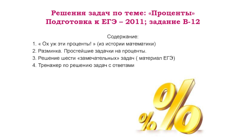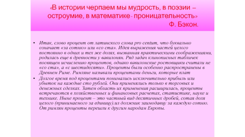 Долгое время под процентами понимались исключительно прибыль или убыток на каждые сто рублей. Они применялись только в торговых и денежных сделках. Затем область их применения расширилась, проценты встречаются в хозяйственных и финансовых расчетах, статистике, науке и технике. Ныне процент – это частный вид десятичных дробей, сотая доля целого (принимаемого за единицу).ил должник заимодавцу за каждую сотню. От римлян проценты перешли к другим народам Европы.