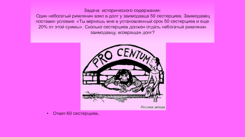 Итак, слово процент от латинского слова pro centum, что буквально означает «за сотню» или «со ста». Идея выражения частей целого постоянно в одних и тех же долях, вызванная практическими соображениями, родилась еще в древности у вавилонян. Ряд задач клинописных табличек посвящен исчислению процентов, однако вавилонские ростовщики считали не «со ста», а «с шестидесяти». Проценты были особенно распространены в Древнем Риме. Римляне называли процентами деньги, которые плат