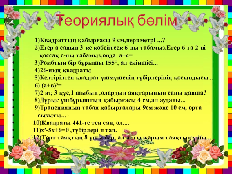 1)Квадраттың қабырғасы 9 см,периметрі ...?