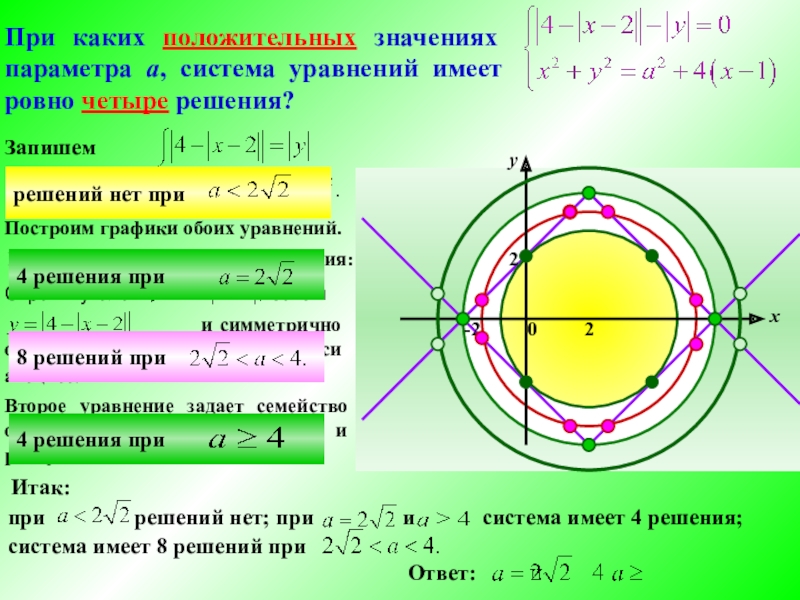 Второе уравнение задает семейство окружностей с центром (2;0) и радиусом а.