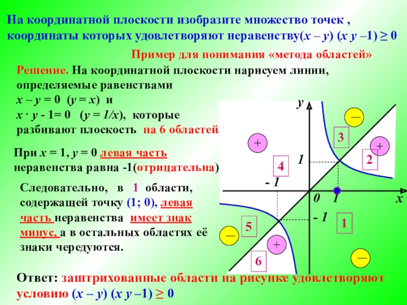Ответ: заштрихованные области на рисунке удовлетворяют условию (х – у) (х у –1) ≥ 0