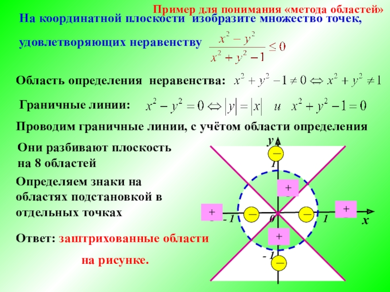 Следовательно, в 1 области, содержащей точку (1; 0), левая часть неравенства имеет знак минус, а в остальных областях её знаки чередуются.