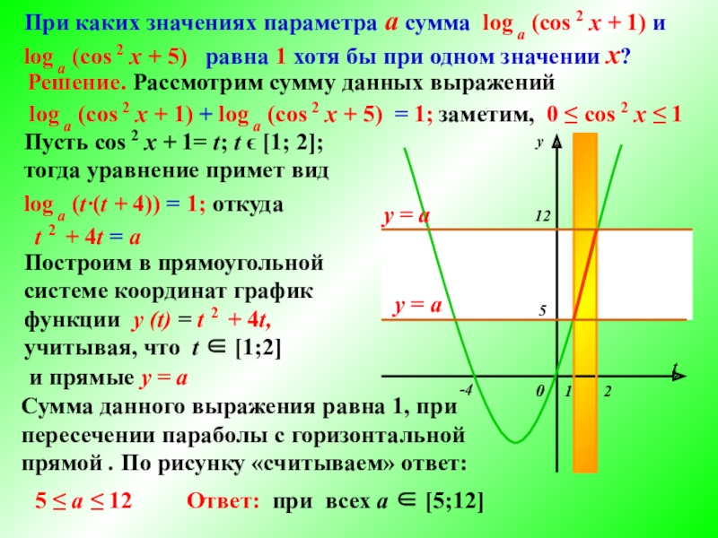 При каких значениях параметра а сумма log a (cos 2 x + 1) и log a (cos 2 x + 5) равна 1 хотя бы при одном значении х?