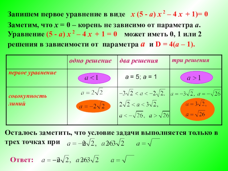 Заметим, что х = 0 – корень не зависимо от параметра а. Уравнение (5 - а) х 2 – 4 х + 1 = 0 может иметь 0, 1 или 2 решения в зависимости от параметра а и D = 4(a – 1).