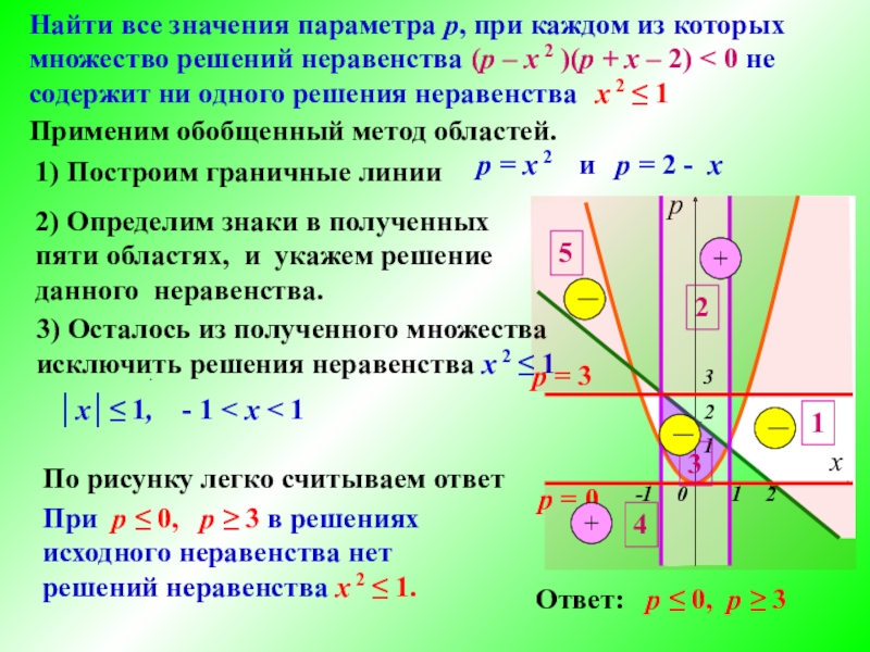 При р ≤ 0, р ≥ 3 в решениях исходного неравенства нет решений неравенства х 2 ≤ 1.