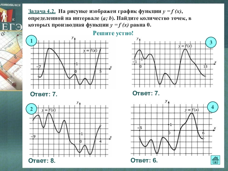 Решение. Прямая у = 8 — горизонтальная, значит, если касательная к графику функции ей параллельна, то она тоже горизонтальна. Следовательно, при решении этой задачи можно воспользоваться решением задачи 2, то есть приложить линейку или край листа бумаги горизонтально и, двигая его «вниз», сосчитать количество точек с горизонтальной касательной.