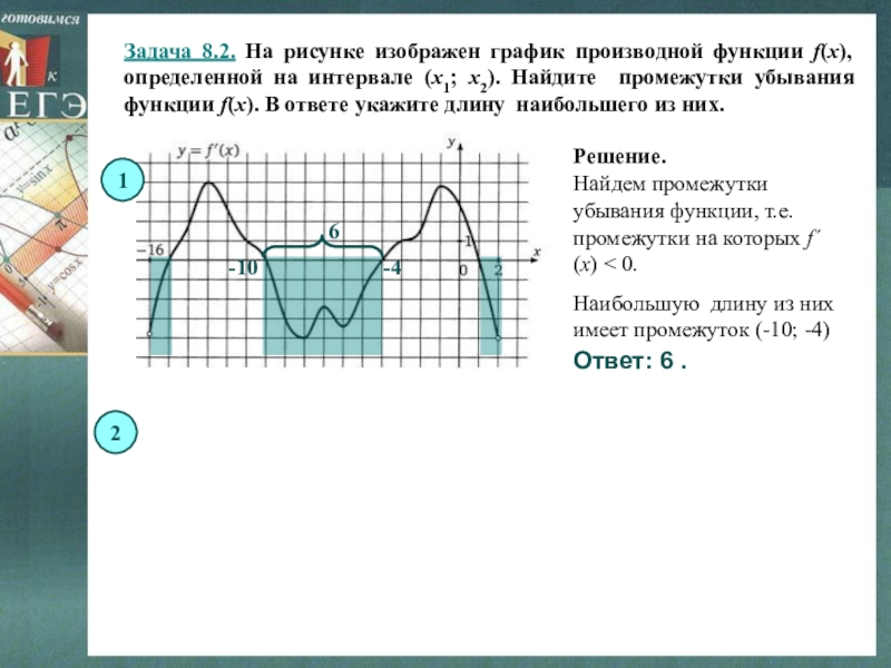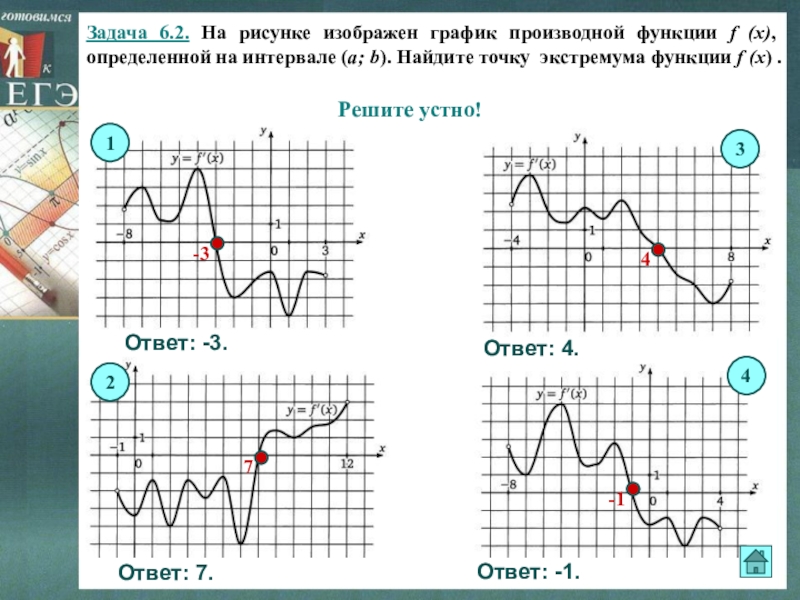 Поступим аналогично, найдем точку, в которой f´(x) = - 4, проведем горизонтальную прямую y = - 4 и найдем абсциссу точки пересечения этой прямой с графиком производной.