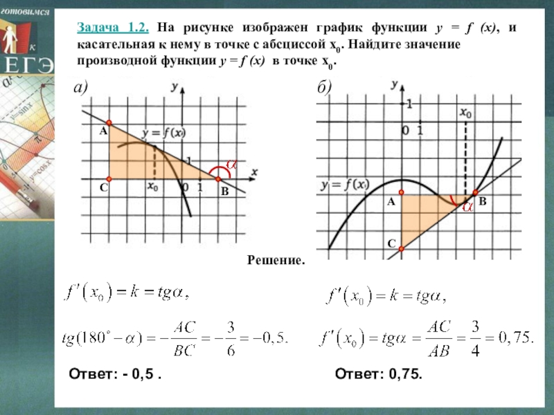 Значение производной функции f(x) в точке х0 равно tga — угловому коэффициенту касательной, проведенной к графику этой функции в данной точке. Чтобы найти угловой коэффициент, выберем две точки А и В, лежащие на касательной, абсциссы и ординаты которых — целые числа. Теперь определим модуль углового коэффициента. Для этого построим ∆ABC. Важно помнить, что тангенс острого угла прямоугольного треугольника — это отношение противолежащего катета к прилежащему.