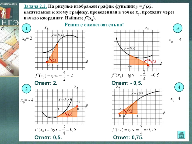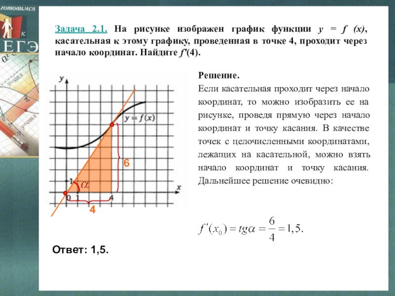 На рисунке изображен график функции y = f (x), касательная к этому графику, проведенная в точке х0, проходит через начало координат. Найдите f'(х0).