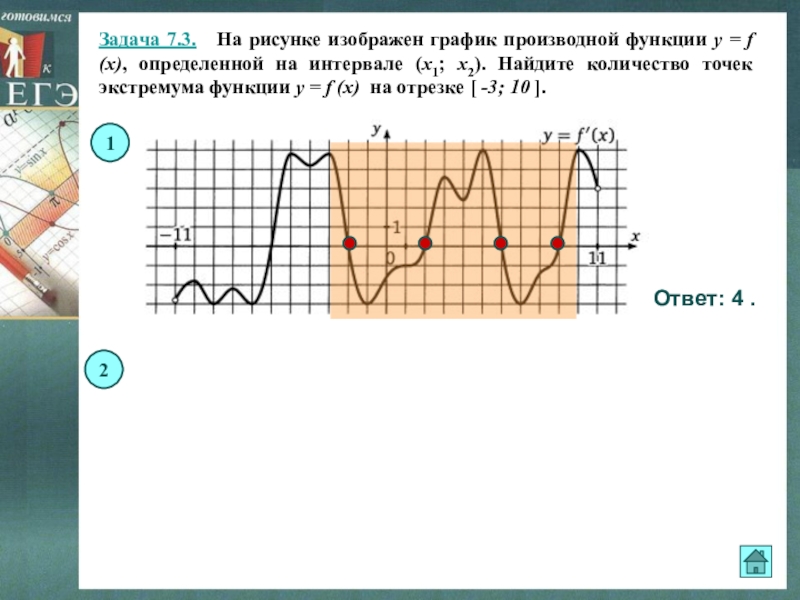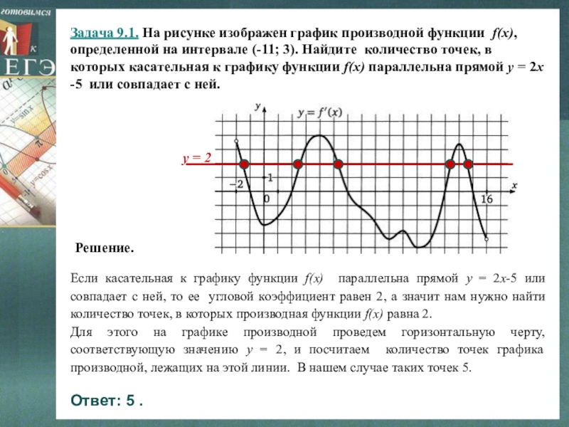 Для этого на графике производной проведем горизонтальную черту, соответствующую значению y = 2, и посчитаем количество точек графика производной, лежащих на этой линии. В нашем случае таких точек 5.