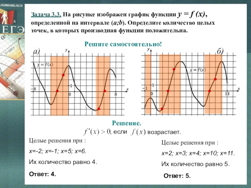 На рисунке изображен график функции y = f (x), определенной на интервале (a; b). Определите количество целых точек, в которых производная функции отрицательна (положительна).