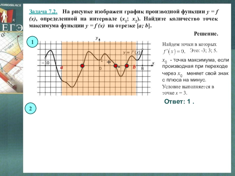 На рисунке изображен график производной функции y = f (x), определенной на интервале (x1; x2). Найдите количество точек максимума (минимума) функции y = f (x) на отрезке [a; b].