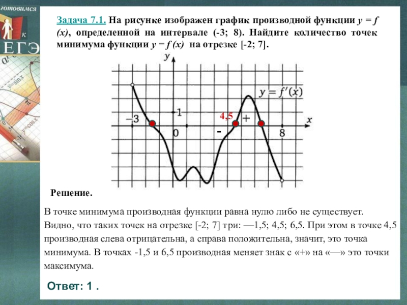 Задача 7.1. На рисунке изображен график производной функции y = f (x), определенной на интервале (-3; 8). Найдите количество точек минимума функции y = f (x) на отрезке [-2; 7].