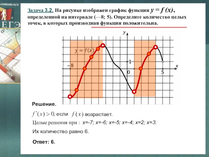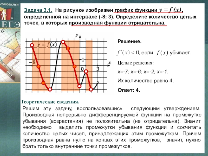 Решим эту задачу, воспользовавшись следующим утверждением. Производная непрерывно дифференцируемой функции на промежутке убывания (возрастания) не положительна (не отрицательна). Значит необходимо выделить промежутки убывания функции и сосчитать количество целых чисел, принадлежащих этим промежуткам. Причем производная равна нулю на концах этих промежутков, значит, нужно брать только внутренние точки промежутков.