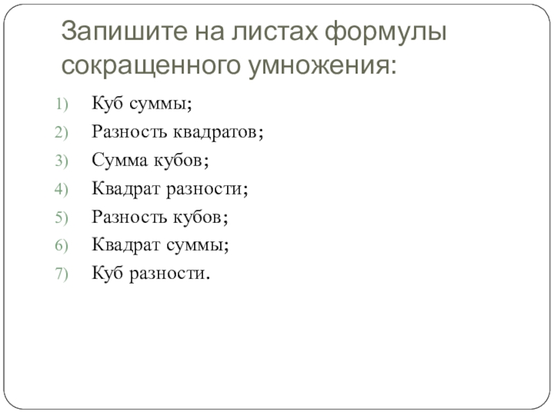 Слайд 3Запишите на листах формулы сокращенного умножения: