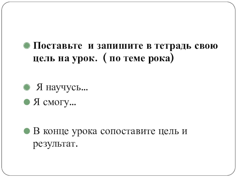 Слайд 2Поставьте и запишите в тетрадь свою цель на урок. ( по