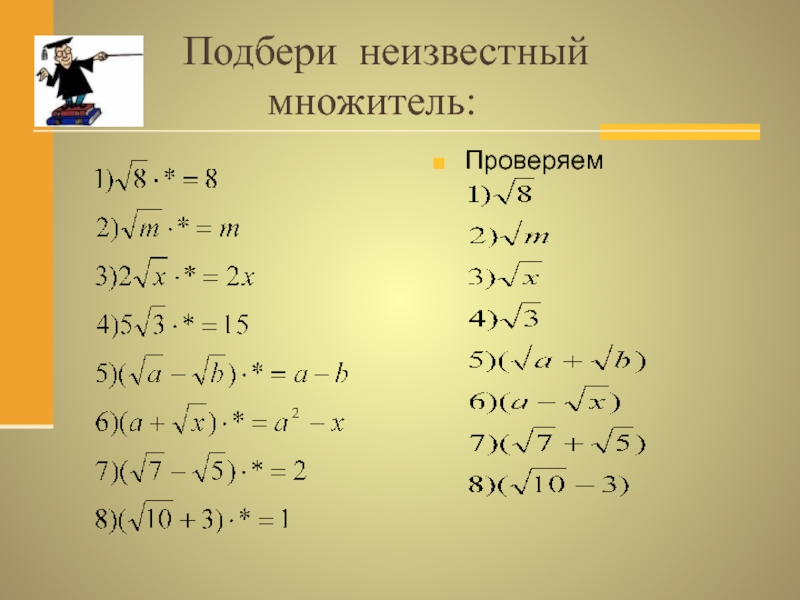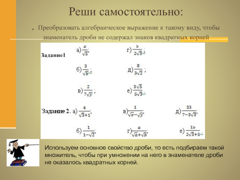 2. Если знаменатель содержит множитель , то числитель и знаменатель дроби умножают на