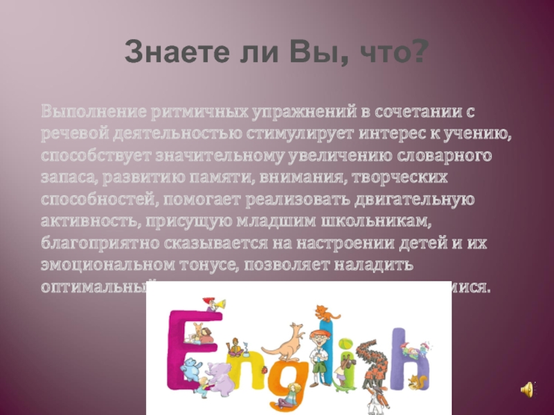 стимулирует интерес к учению, способствует значительному увеличению словарного запаса, развитию памяти, внимания, творческих способностей, помогает реализовать двигательную активность, присущую младшим школьникам, благоприятно сказывается на настроении детей и их эмоциональном тонусе, позволяет наладить оптимальный контакт между учителем и учащимися.