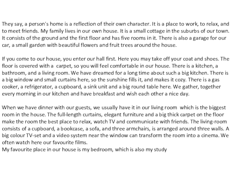 character. It is a place to work, to relax, and to meet friends. My family lives in our own house. It is a small cottage in the suburbs of our town. It consists of the ground and the first floor and has five rooms in it. There is also a garage for our car, a small garden with beautiful flowers and fruit trees around the house.