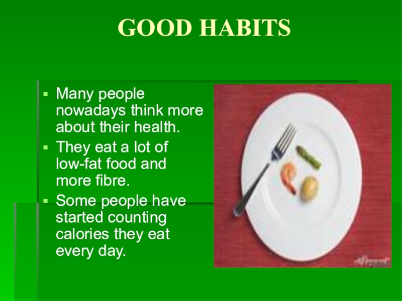 GOOD HABITSMany people nowadays think more about their health.They eat a lot of low-fat food and more
