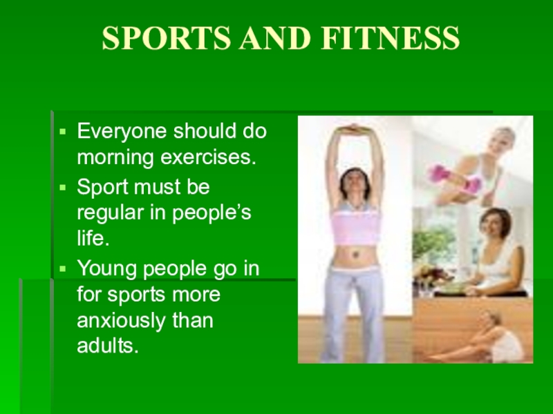 SPORTS AND FITNESSEveryone should do morning exercises.Sport must be regular in people’s life.Young people go in for