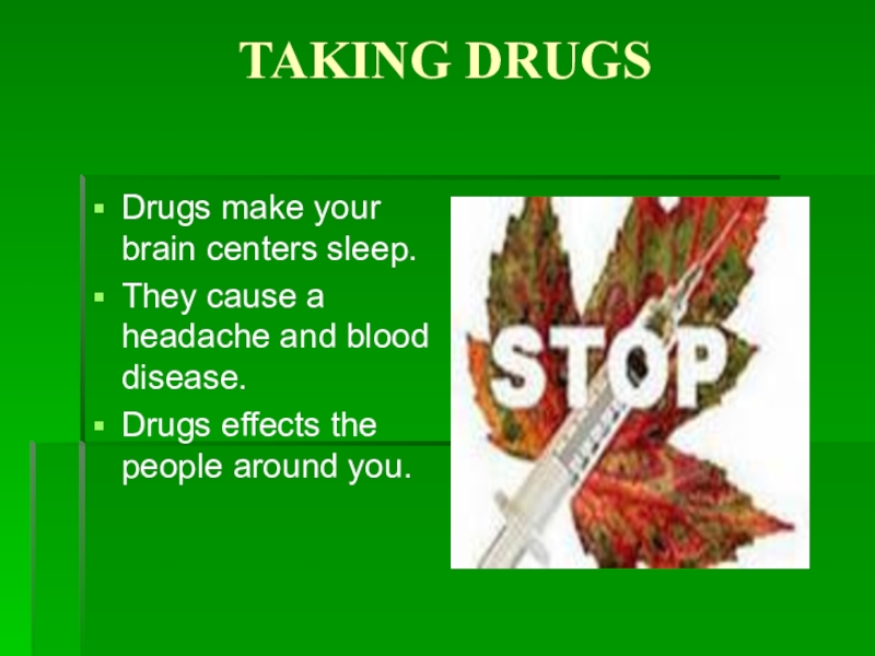 TAKING DRUGSDrugs make your brain centers sleep.They cause a headache and blood disease.Drugs effects the people around