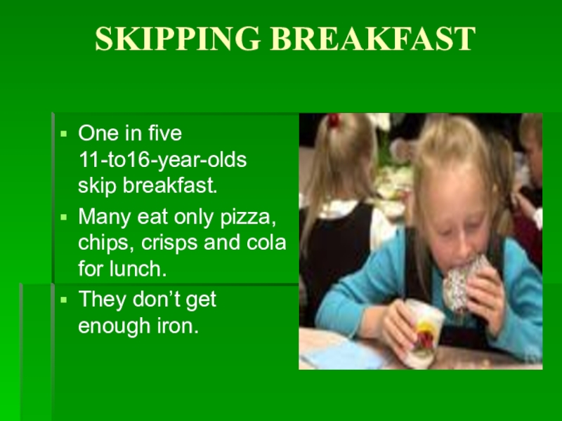 SKIPPING BREAKFASTOne in five 11-to16-year-olds skip breakfast.Many eat only pizza, chips, crisps and cola for lunch.They don’t