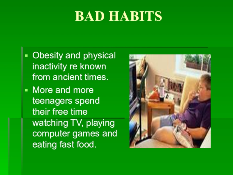 BAD HABITSObesity and physical inactivity re known from ancient times.More and more teenagers spend their free time watching TV, playing computer games and eating fast food.