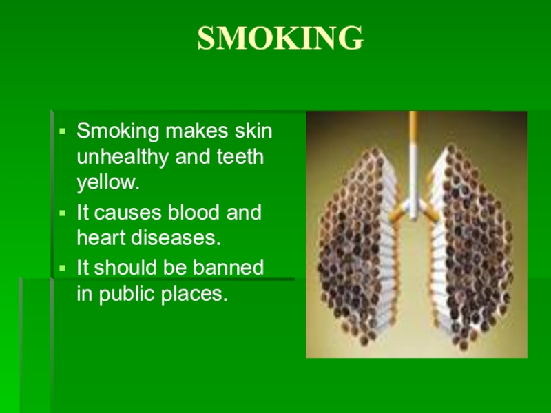 SMOKINGSmoking makes skin unhealthy and teeth yellow.It causes blood and heart diseases.It should be banned in public