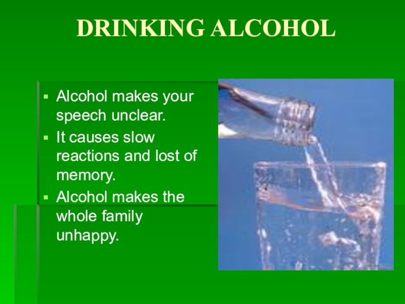 DRINKING ALCOHOLAlcohol makes your speech unclear.It causes slow reactions and lost of memory.Alcohol makes the whole family