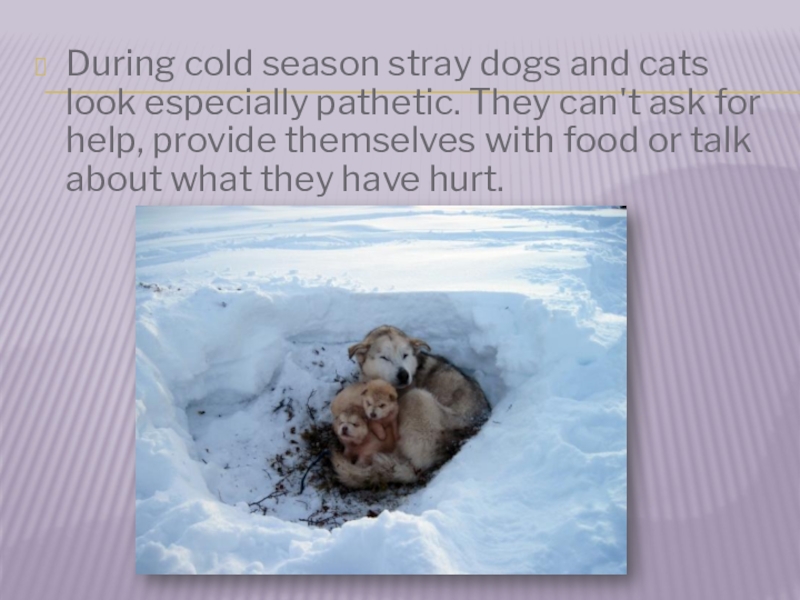 Слайд 3During cold season stray dogs and cats look especially pathetic. They