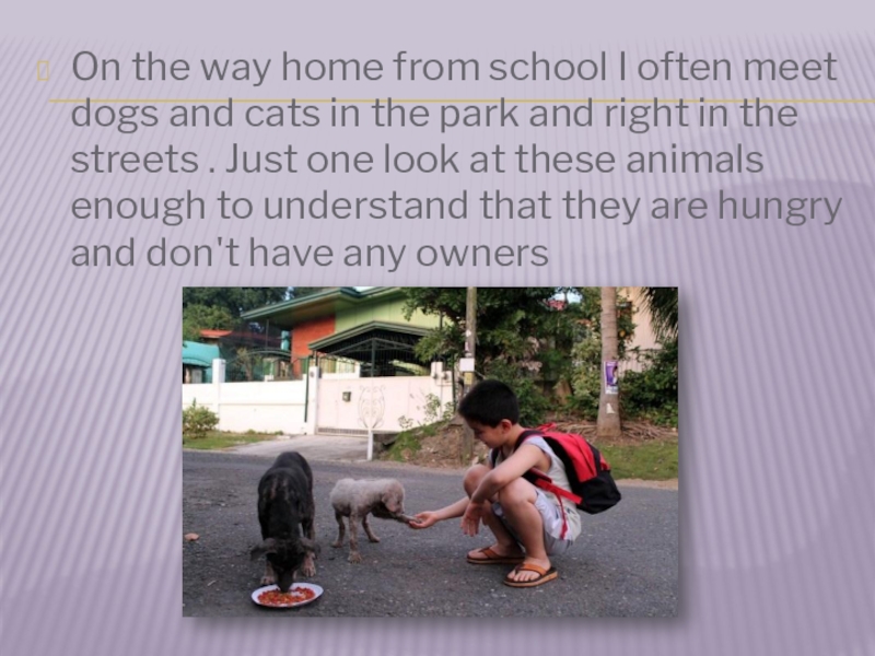 On the way home from school I often meet dogs and cats in the park and right in the streets . Just one look at these animals enough to understand that they are hungry and don't