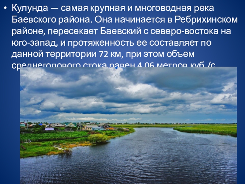Слайд 6Кулунда — самая крупная и многоводная река Баевского района. Она начинается
