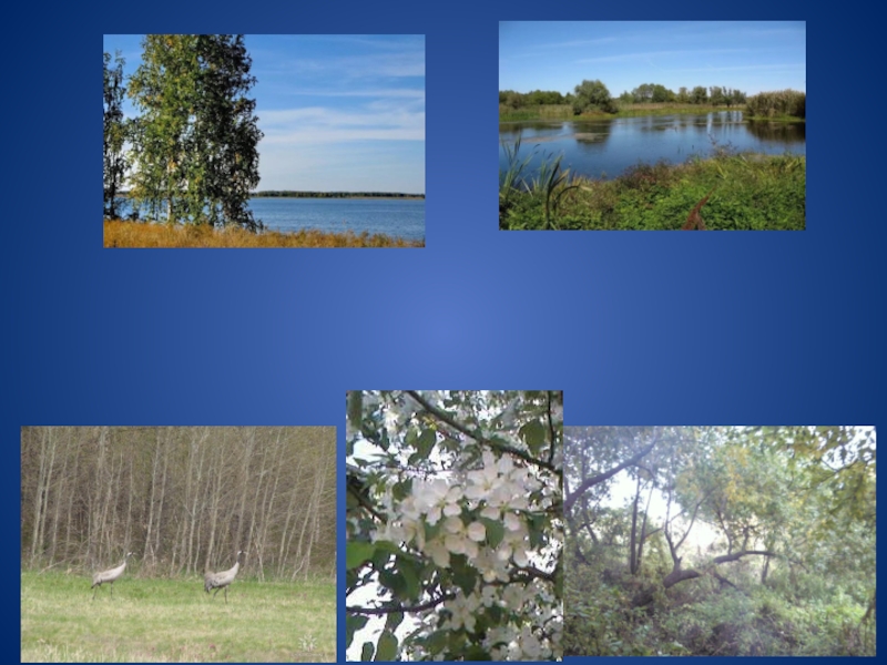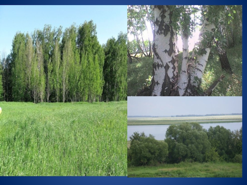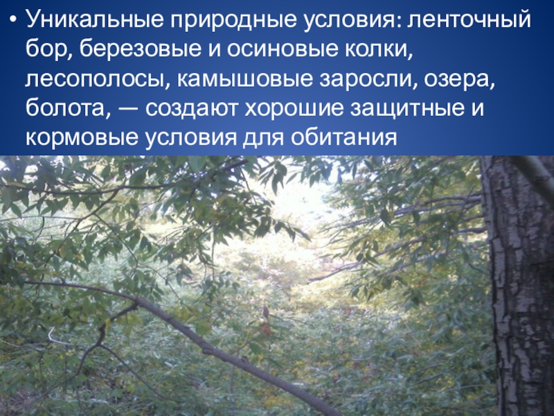 Слайд 7Уникальные природные условия: ленточный бор, березовые и осиновые колки, лесополосы, камышовые